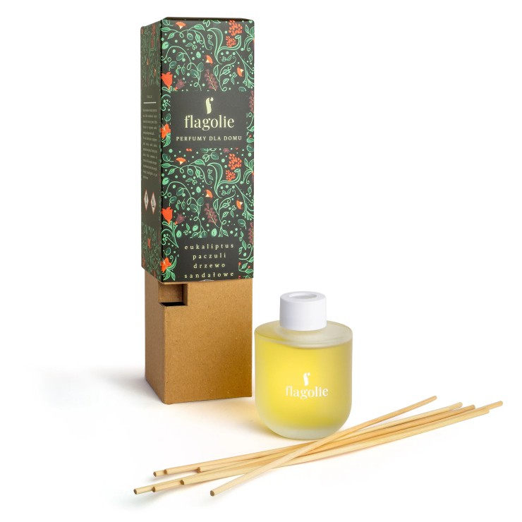 Perfumy dla domu- Dyfuzor Eukaliptus, Paczuli, Drzewo Sandałowe Flagolie. Perfumy do wnętrz w formie pachnących patyczków. Dyfuzor zawiera starannie dobraną substancję zapachową, która dzięki patyczkom rattanowym przedostaje się do powietrza. Pomieszczenie wypełnia się przyjemnym aromatem, który utrzymuje się przez długi czas. Perfumy dla domu eukaliptus, paczuli, drzewo sandałowe to ciepły, balsamiczny i szlachetny zapach.