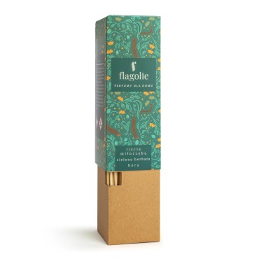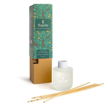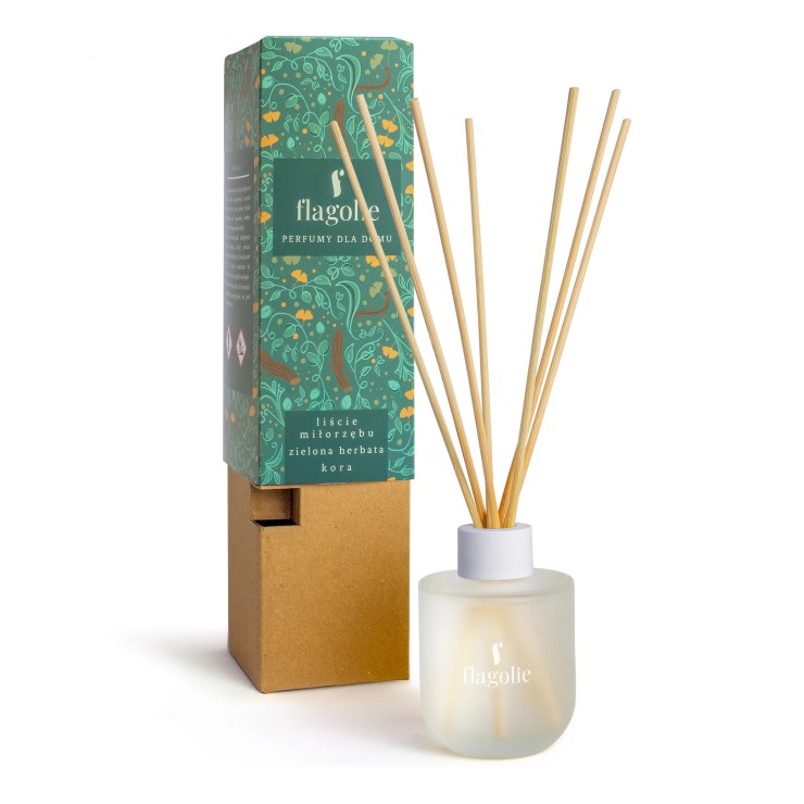 Perfumy dla domu- Dyfuzor Liść Miłorzędu, Zielona Herbata, Kora Flagolie. Niezwykle wydajne perfumy do wnętrz w formie pachnących patyczków, zamknięte w szklanym, matowym pojemniku. Dzięki patyczkom rattanowym zapach przedostaje się do powietrza i szybko wypełnia pomieszczenie przyjemnym aromatem. Perfumy dla domu Liście miłorzębu, Zielona herbata, Kora to subtelny zapach typu Fougére. Dominują w nim świeże i rześkie, drzewno-zielone nuty. To doskonała alternatywa dla osób, które szukają świeżości, ale nie przepadającymi za kwiatowymi aromatami.