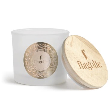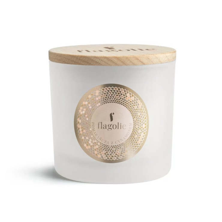 Sojowa świeca zapachowa Pomarańcza z cynamonem Flagolie. Świeca do wnętrz o zapachu pomarańczy z cynamonem, wykonana ręcznie z naturalnego wosku sojowego wolnego od GMO, pestycydów i sztucznych dodatków. Wylana w białym, matowym słoiku z podwójnego szkła. Posiada drewnianą, logowaną nakrętkę. Zapakowana w ozdobny karton z tektury ekologicznej.