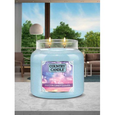 Średnia świeca Cotton Candy Clouds Country Candle. Uwolnij delikatną słodycz z cukrowych chmurek waty cukrowej, różowych jagód i kremowej, miękkiej wanilii.