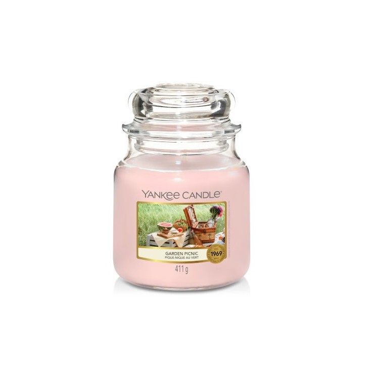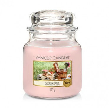 Średnia świeca Garden Picnic Yankee Candle. Zabierz koc i kosz wypełniony soczystymi, dojrzałymi owocami owocami i wybierz się na słoneczny piknik pośród kwiatów.