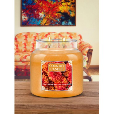 Średnia świeca Golden Mums & Honeycrisp Country Candle. Golden Mums & Honeycrisp to połączenie przypraw korzennych i pomarańczy przełamane chrupkim i soczystym jabłkiem Honeycrisp wraz z zapachem bujnie kwitnących chryzantem przypomina nam o schyłku lata podczas ciepłych, promiennych dni nadchodzącej jesieni.