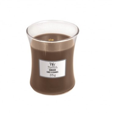 Średnia świeca Humidor Woodwick. Mieszanka liści tytoniu, miękkiego zamszu i brzoskwiniowego kwiatu.
