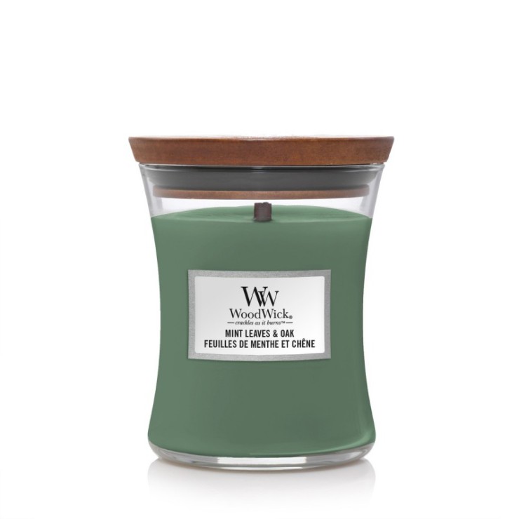 Średnia świeca Mint Leaves & Oak Woodwick. Zapach świeżo zerwanych liści mięty połączony z nutą zielonego mchu i wędzonego dębu.