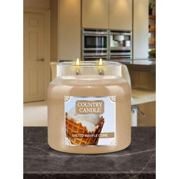Średnia świeca Salted Waffle Cone Country Candle. Co jest najlepsze do udekorowania złotego maślanego rożka waflowego? Tęczowa posypka z dodatkiem karmelowego sosu z solą morską i obfitą gałką lodów waniliowych!
