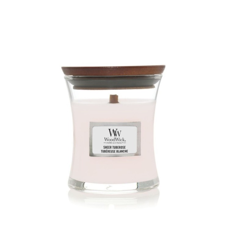 Średnia świeca Sheer Tuberose WoodWick. Delikatny zapach płatków jaśminu dopełniony kwiatowym aromatem geranium, tuberozy i piżma.