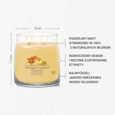 Średnia świeca Signature Autumn Sunset Yankee Candle Jesienny zachód słońca...nuty cedru połączone z aromatycznymi cytrusami i drzewem sandałowym.