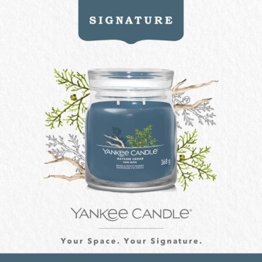 Średnia świeca Signature Bayside Cedar Yankee Candle Wybierz się na spacer leśną ścieżką w deszczu, gdzie w powietrzu unoszą się orzeźwiające nuty grejpfruta, kwiatów mandarynki i ciepłego bursztynu.