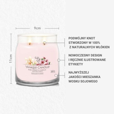 Średnia świeca Signature Pink Cherry & Vanilla Yankee Candle Zapach dojrzałych wiśni i malin otulonych puszystym waniliowo-migdałowym kremem.