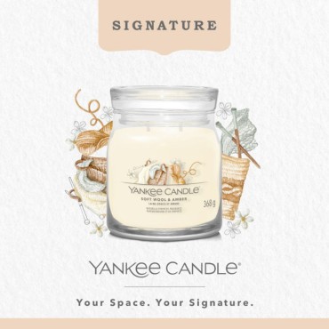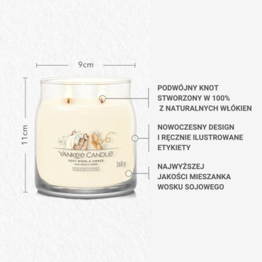 Średnia świeca Signature Wool & Amber Yankee Candle Otul się przytulnym, ręcznie robionym kocem. Wyjątkowa i ciepła mieszanka nut bursztynu, jaśminu i kaszmiru.