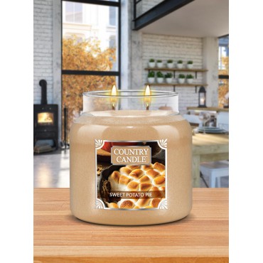 Średnia świeca Sweet Potato Pie Country Candle. Sweet Potato Pie to uczta dla zmysłów. Puree ze słodkich ziemniaków, brązowy cukier oraz perfekcyjnie dobrane przyprawy korzenne podane z ciemnym rumem, wanilią i kandyzowanym klonem.