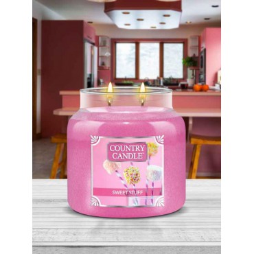 Średnia świeca Sweet Stuff Country Candle. Aromatyczny aromat cytrusów, róży damasceńskiej, jaśminu i kokosa, ciepły bursztyn, drzewo sandałowe i fasolka tonka dodają delikatnej, słodkiej kwiatowej esencji Sweet Stuff.