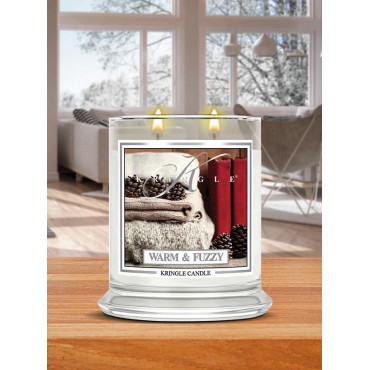 Średnia świeca Warm and Fuzzy Kringle Candle. Ciepły, pudrowy akord łączy się z drzewem cedrowym oraz nutą fiołków i róży, zapewniając kojący, przytulny zapach.