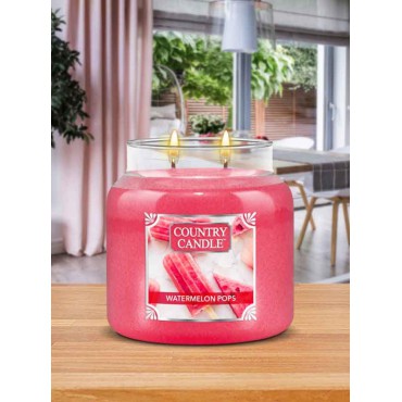 Średnia świeca Watermelon Pops Country Candle. Watermelon Pops to owocowe lody gwarantują idealne ochłodzenie, w gorące letnie dni. Orzeźwiający arbuz, musująca limonka i gałązka świeżej mięty stanowią podstawę niezwykłego letniego zapachu. Delikatne nuty cytryny i drobne niuanse cukru wspaniale dopełniają letnie doznania zapachowe.