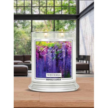 Średnia świeca Wisteria Kringle Candle. Ciepła letnia bryza niesie uwodzicielski aromat wisterii i kwitnącego nocą jaśminu przeplatanego nutami aromatycznej gardenii i kwiatu pomarańczy. Uroku dodają jej płatki ylang ylang posypane różowym pieprzem, ambra szałwiową i jasnym drzewem.