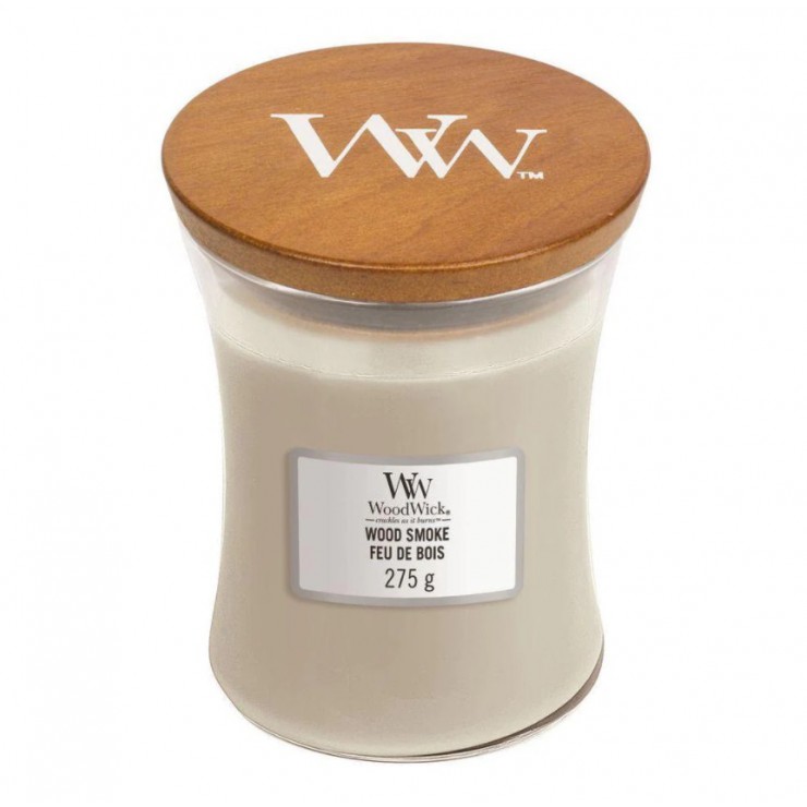 Średnia świeca Wood Smoke Woodwick. Prawdziwy zapach drewna cedrowego i żarzących się drewienek – nostalgiczny komfort skwierczącego ognia.