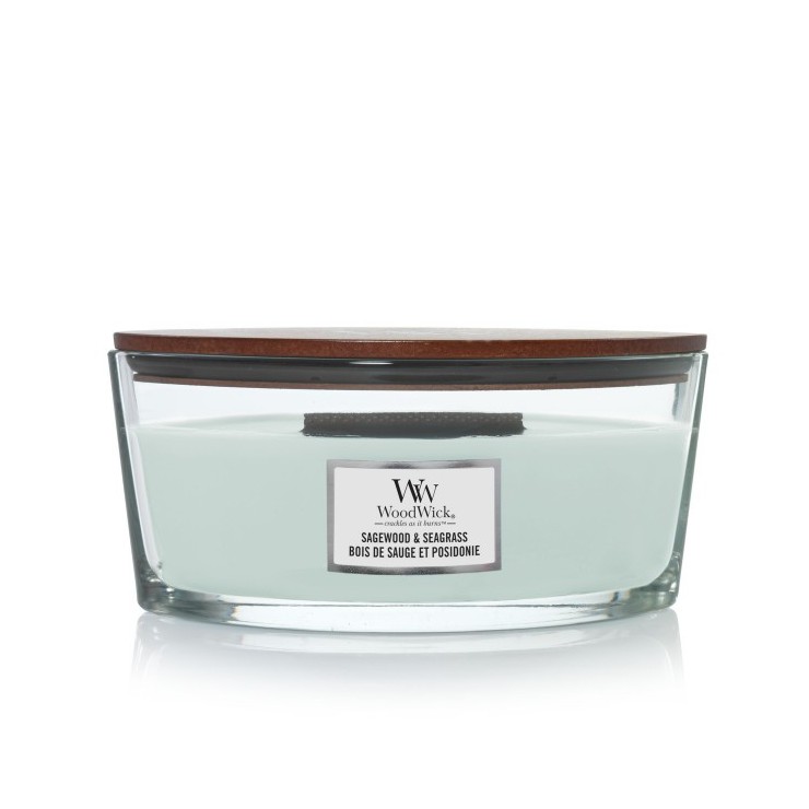 Świeca Hearthwick Sagewood & Seagrass WoodWick. Świeży, pudrowy zapach cierpkich cytrusów połączony z aromatem minerałów morskich i szałwii.
