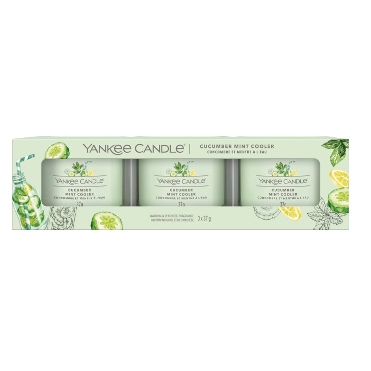 Świeca mini 3 pack Cucumber Mint Cooler Yankee Candle. Poczuj zapach orzeźwiającego i aromatycznego napoju na bazie ogórka, cytryny i mięty.