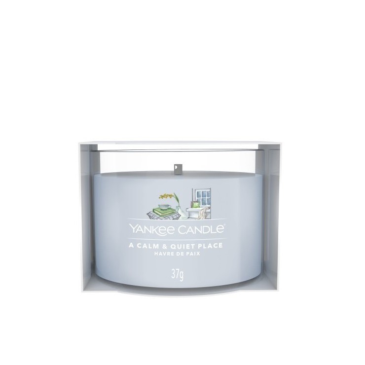 Świeca mini A Calm&Quiet Place Yankee Candle. Stworzony do kontemplacji, niezwykle zrównoważony zapach, złożony z pozostających w idealnej harmonii delikatnego jaśminu, ciepłego piżma i eterycznej paczuli.