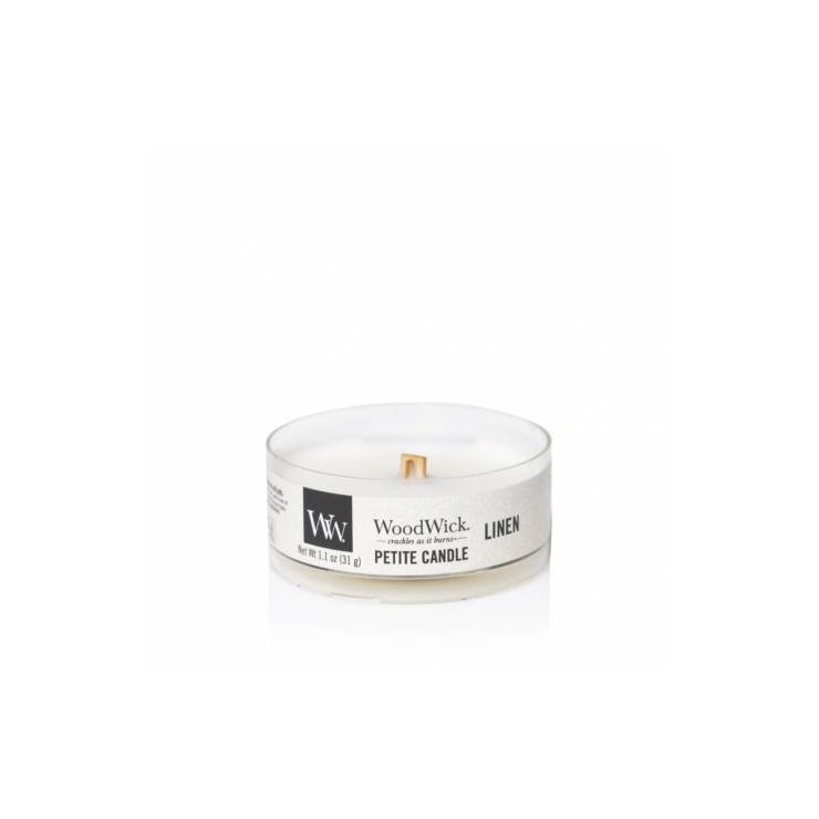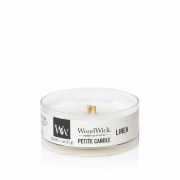 Świeca Petite Linen WoodWick. Relaksujący zapach czystej pościeli, suszonej delikatnym, letnim wiatrem.