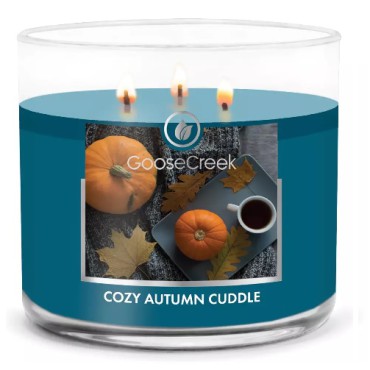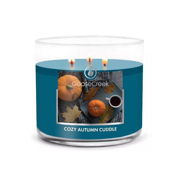 Świeca Tumbler Cozy Autumn Cuddle Goose Creek Candle. Poczuj się wypoczęty z książką w ręku, ukrytą pod tkanymi kocami. Tak przytulnie!