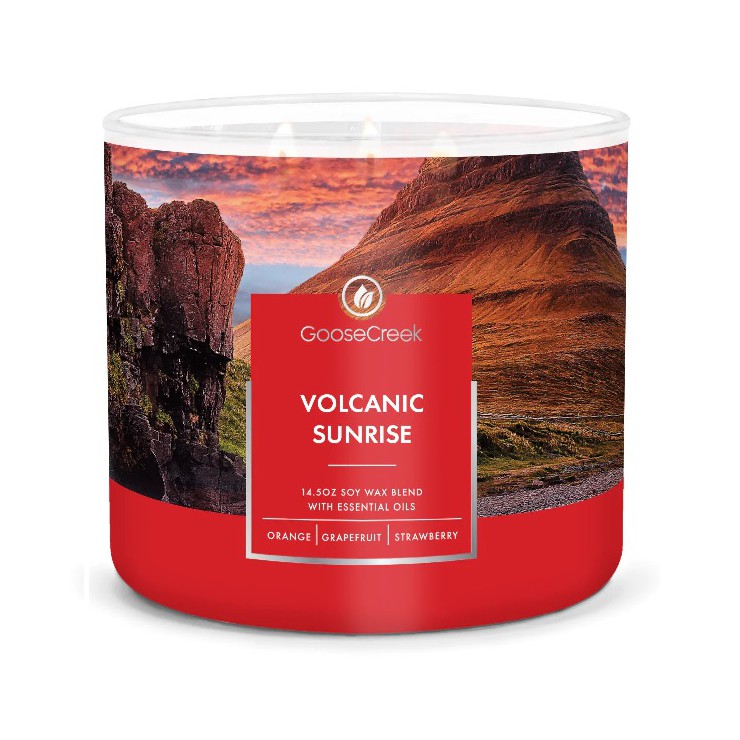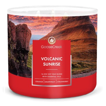 Świeca Tumbler Volcanic Sunrise Goose Creek Candle. Nieokiełznana oaza bujności zamknięta w aromacie pomarańczy, grejpfruta, truskawek i limonki.