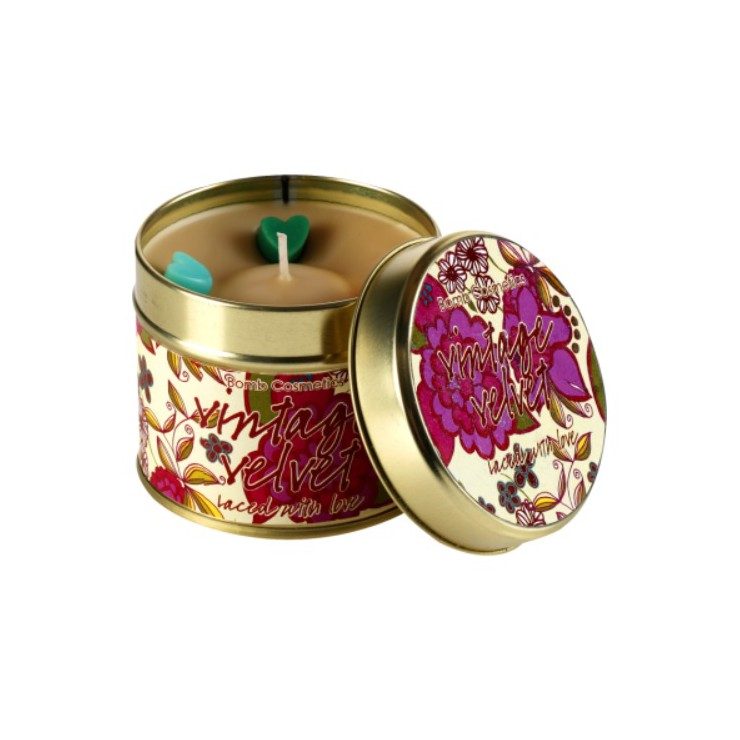 Świeca zapachowa w puszce Vintage Velvet Bomb Cosmetics. Prawdziwie obfity w eleganckie nuty, kwiatowo-piżmowy aromat, utkany z luksusowych akordów heliotropu i kwiatów bzu, białych fiołków i ylang ylang, otulonych warstwami jedwabistego piżma. Wanilia i nuty drzewne wypełniają bazę zapachu, podczas gdy nutka bergamotki odświeża górę aromatu. W świecy mieszkają też dobroczynne olejki z Róży i Geranium, które potęgują poczucie absolutnego luksusu!
