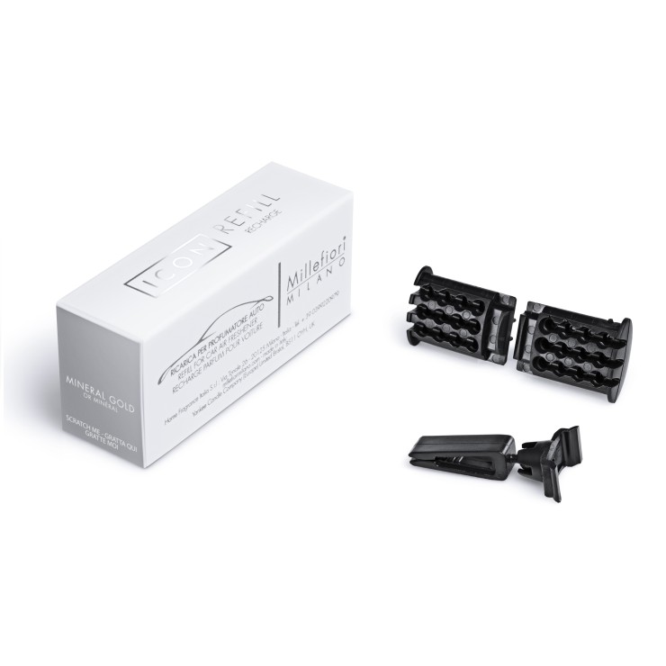 Uzupełniacz do odświeżacza Car Icon Mineral Gold Millefiori Milano. Jubileuszowy Zapach Millefiori Milano - wyjątkowa i zaskakująca kreacja zapachowa zainspirowana kontrastem pomiędzy metalicznym chłodem srebra i iskrzącym ciepłem złota. Mineral Gold to hołd oddany pięknu metali szlachetnych, wybitna harmonia akordów łącząca świeżość i ciepło.