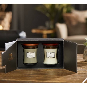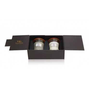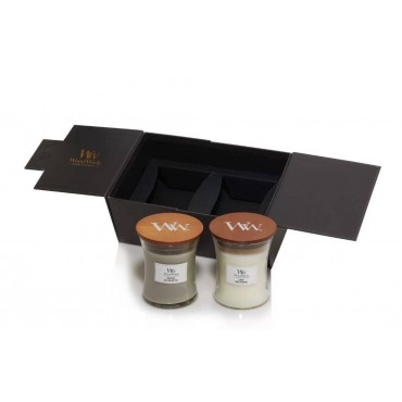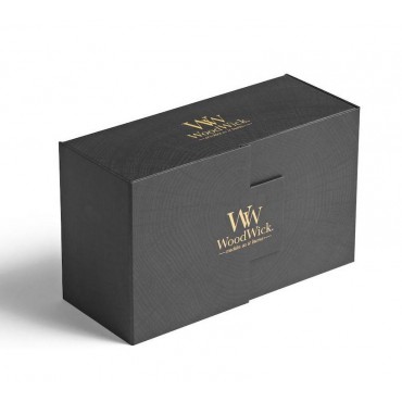 Cechą charakterystyczną świec marki WoodWick jest naturalny, drewniany knot, którego dźwięk przypomina skwierczenie drewna w kominku. Świeca stanowi elegancką ozdobę każdego pomieszczenia. Zestaw WoodWick jest idealnym pomysłem na prezent. Całość zamknięta została w eleganckie, czarne pudełko. W skład zestawu wchodzą następujące zapachy: Linen, Fireside.