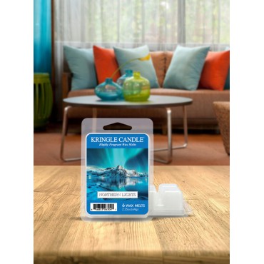 Wosk zapachowy Northern Lights Kringle Candle. Zapach zainspirowany pachnącym i chłodnym powietrzem z krainy północnych jezior. Świeże lasy, ozon i aromatyczne zioła jednoczą się wraz z oświetlającym zapachem zorzy polarnej.