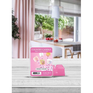 Wosk zapachowy Sweet Stuff Country Candle. Aromatyczny aromat cytrusów, róży damasceńskiej, jaśminu i kokosa, ciepły bursztyn, drzewo sandałowe i fasolka tonka dodają delikatnej, słodkiej kwiatowej esencji Sweet Stuff.