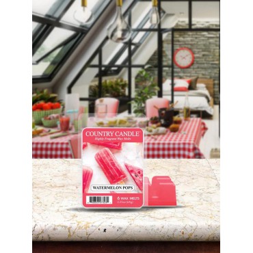 Wosk zapachowy Watermelon Pops Country Candle. Watermelon Pops to owocowe lody gwarantują idealne ochłodzenie, w gorące letnie dni. Orzeźwiający arbuz, musująca limonka i gałązka świeżej mięty stanowią podstawę niezwykłego letniego zapachu. Delikatne nuty cytryny i drobne niuanse cukru wspaniale dopełniają letnie doznania zapachowe.