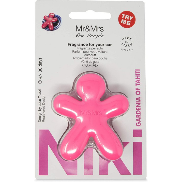 Zapach do samochodu Niki Blister Gardenia of Tahiti Mr & Mrs Fragrance. Zapach do samochodu włoskiej marki Mr & Mrs Fragrance z rodziny Air Friends model Niki Blister o zapachu Gardenia of Tahiti to odświeżacz dla osób, które lubią się wyróżniać. Jest to przyjemny w dotyku produkt w formie ludzika w różowym kolorze – wygląda stylowo! Nuty zapachowe w modelu Niki Blister Gardenia of Tahiti to uwodzicielskie, kwiatowe nuty z odrobiną pikanterii, a następnie słodyczy piżma i wanilii. Zapach do samochodu Niki Blister Gardenia of Tahiti powstał na bazie naturalnych olejków eterycznych bez dodatku alkoholu. Jest produktem w 100% bezpiecznym dla zdrowia, możesz w jego towarzystwie spędzać długie godziny podczas podróży!