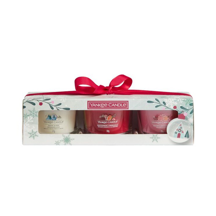 Zestaw 3 świec mini - Snow Globe Wonderland Yankee Candle. Poczuj magiczną atmosferę zimowej krainy dzięki zestawom prezentowym z kolekcji Snow Globe Wonderland. Staranne wykonanie, specjalnie dobrane kolory i śnieżne detale sprawią, że będzie to idealny gwiazdkowy prezent.